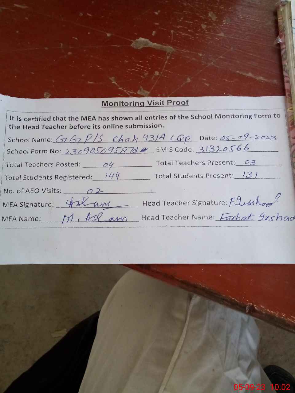 | Attendance Register | Head Teacher | MEA with School | Visit Proof |