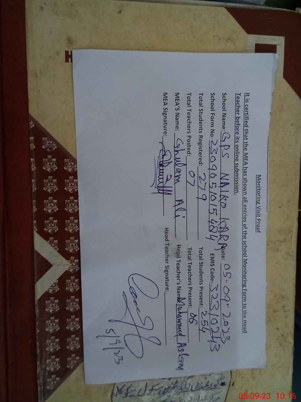 | Attendance Register | Head Teacher | MEA with School | Visit Proof |