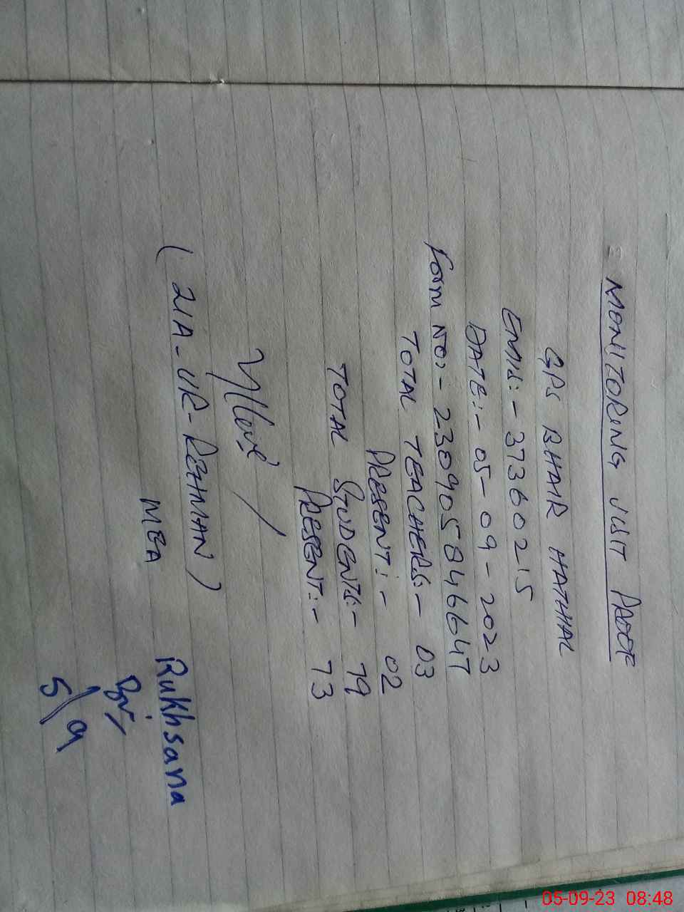 | Monitoring Date: 05-09-2023 | Start Time: 05-09-2023 08:27 AM | End Time: 05-09-2023 08:50 AM | Name of MEA: ZI**** URRE**** | |