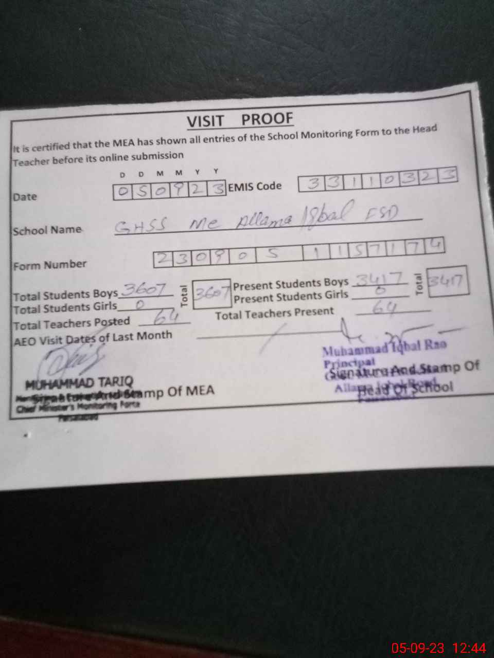 | Attendance Register | Head Teacher | MEA with School | Visit Proof |