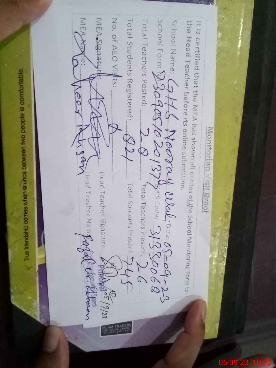 | Attendance Register | Head Teacher | MEA with School | Visit Proof |