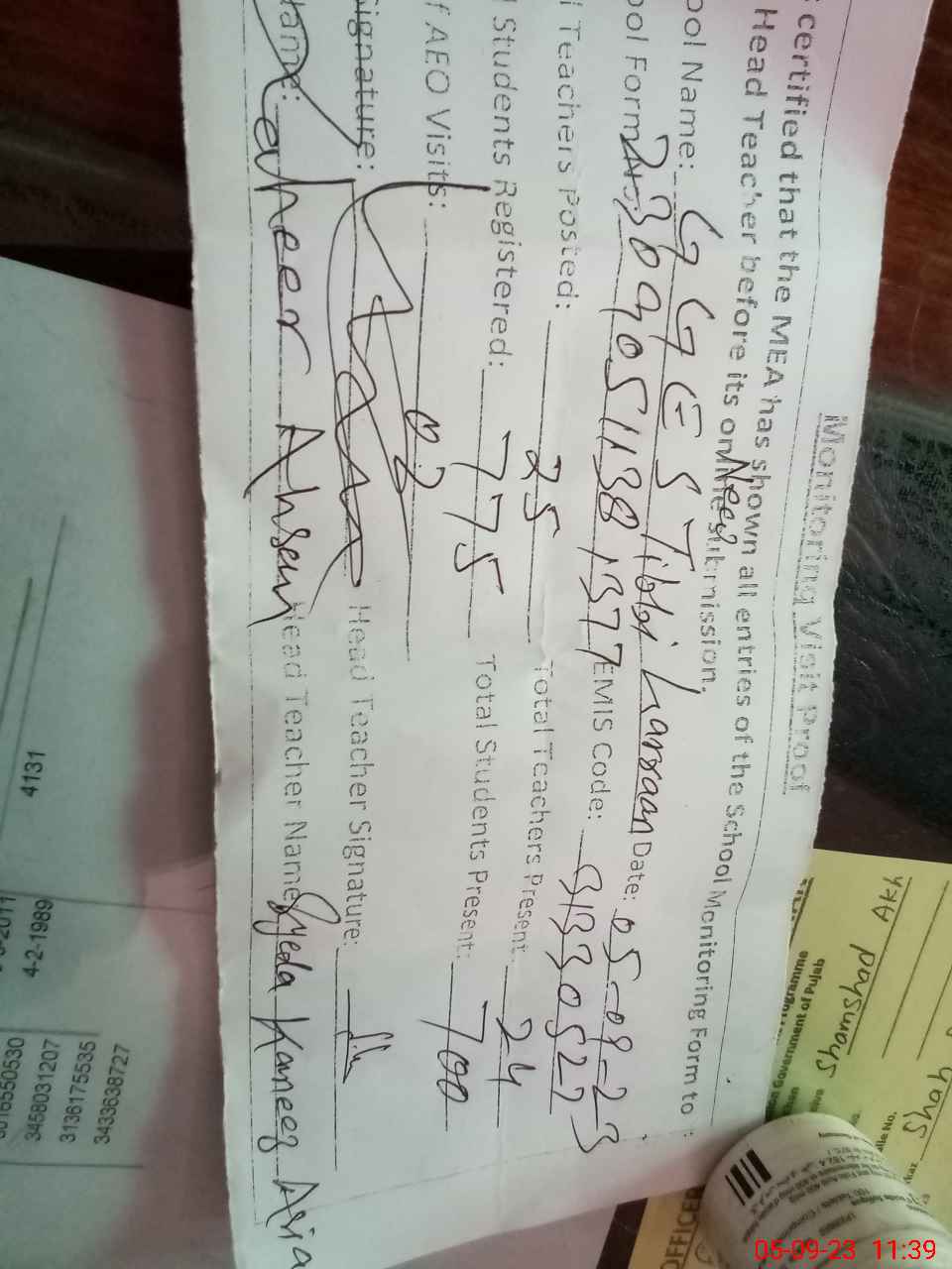 | Attendance Register | Head Teacher | MEA with School | Visit Proof |