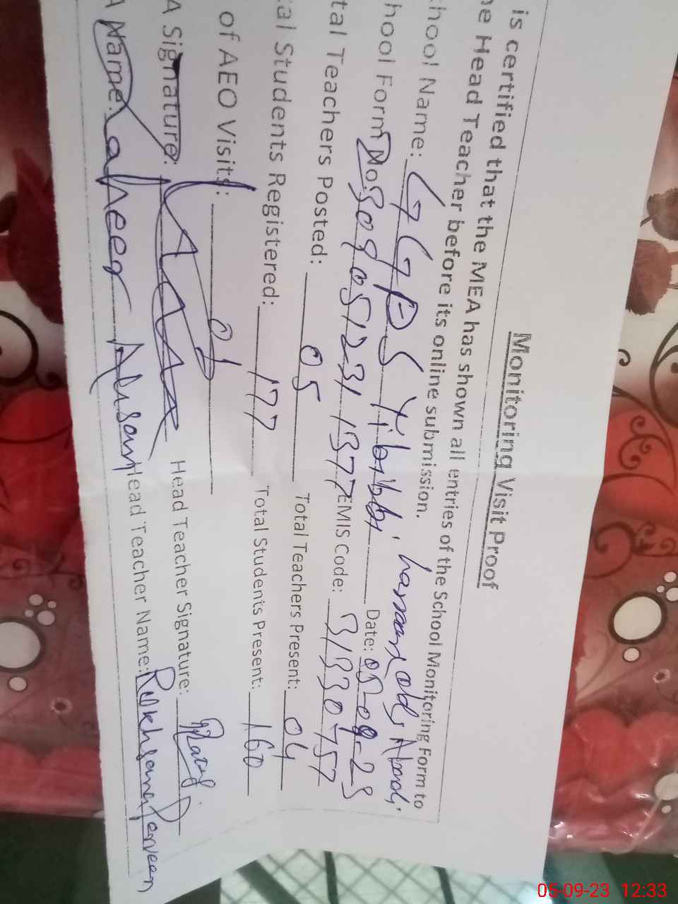| Name: Ru**** Pe**** Designation: (School Headmaster's/Headmistress's) PST Phone/Cell Number: 03**** |