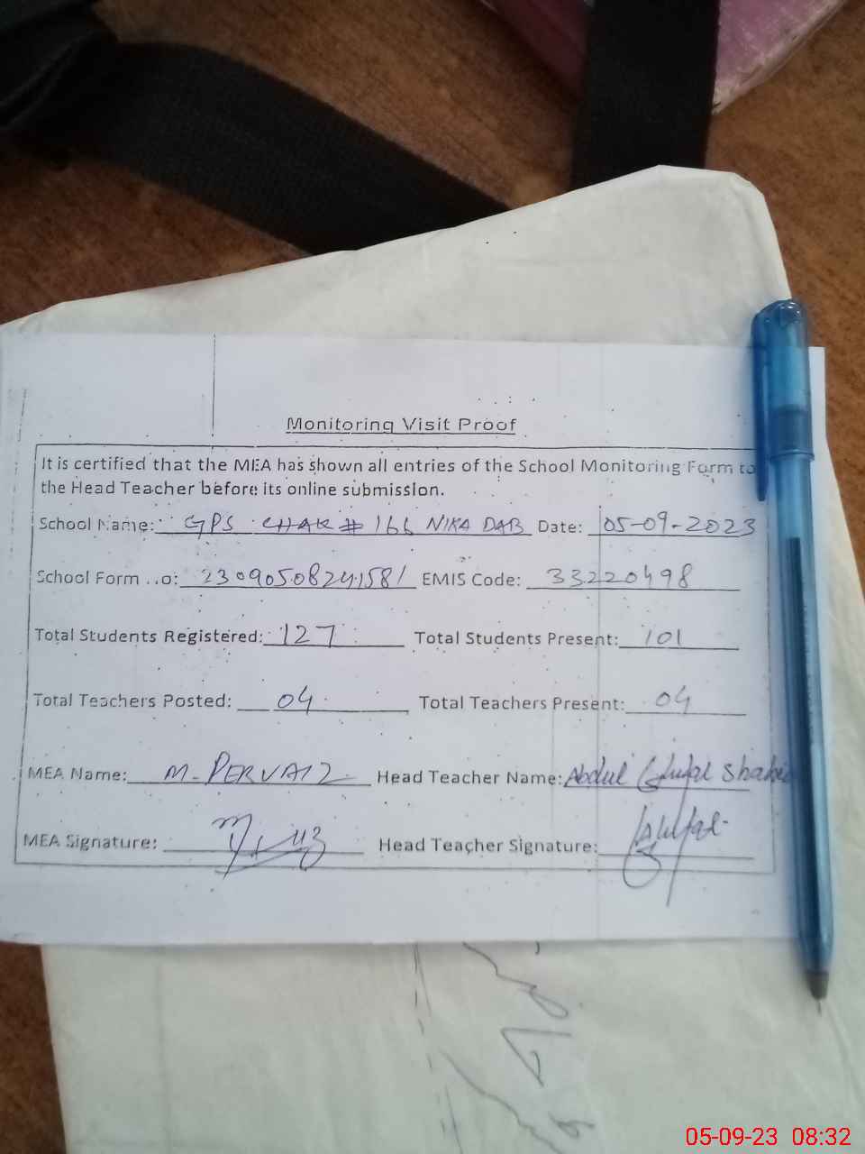 | EMIS Code: 33220498 | Name of School: GPS CHAK NO 166 JB NIKA DAB | |||