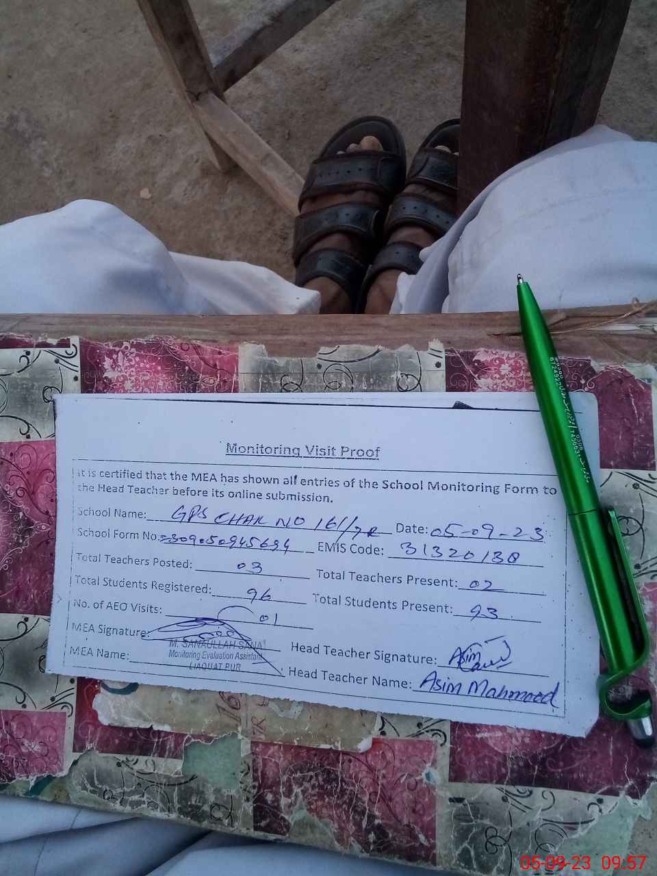 | Monitoring Date: 05-09-2023 | Start Time: 05-09-2023 09:36 AM | End Time: 05-09-2023 09:58 AM | Name of MEA: Mu**** Sa**** Ul**** Sa**** | |