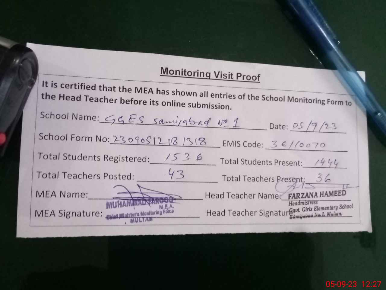 | EMIS Code: 36110070 | Name of School: GGES SAMIJABAD NO.1 MULTAN | |||