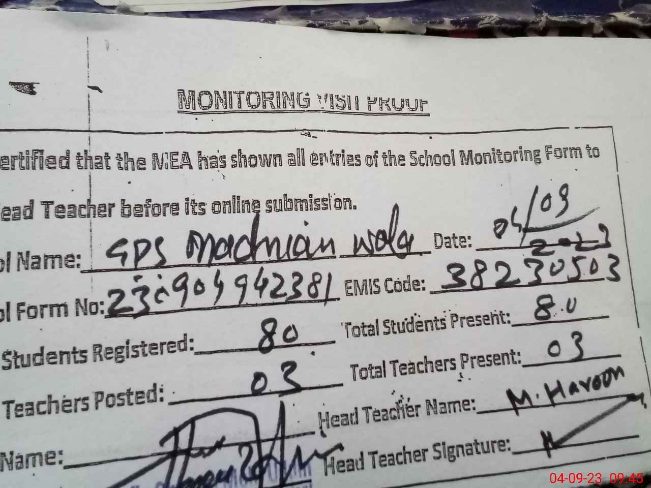| Attendance Register | Head Teacher | MEA with School | Visit Proof |