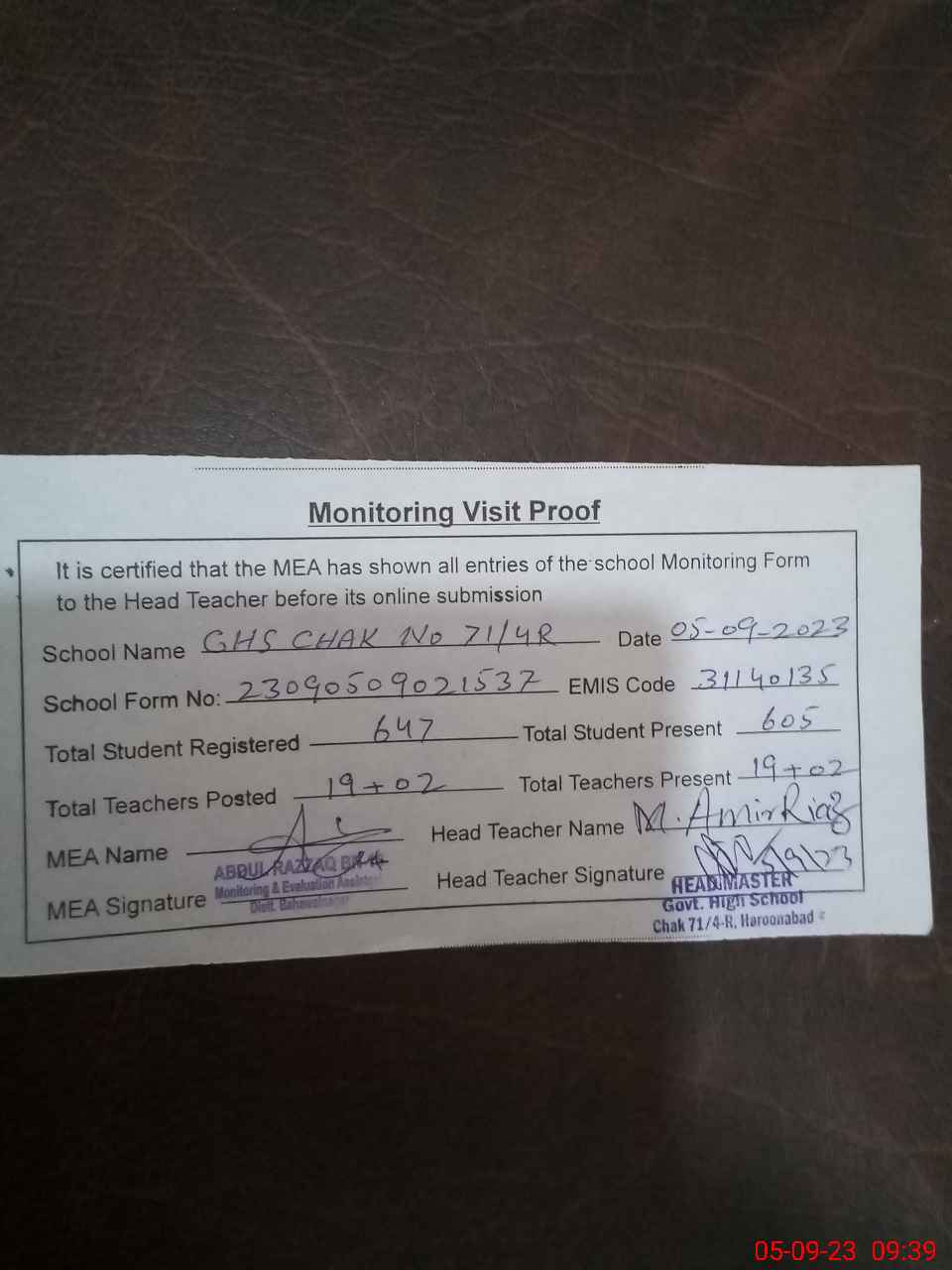 | EMIS Code: 31140135 | Name of School: GHS CHAK NO 71/4-R | |||