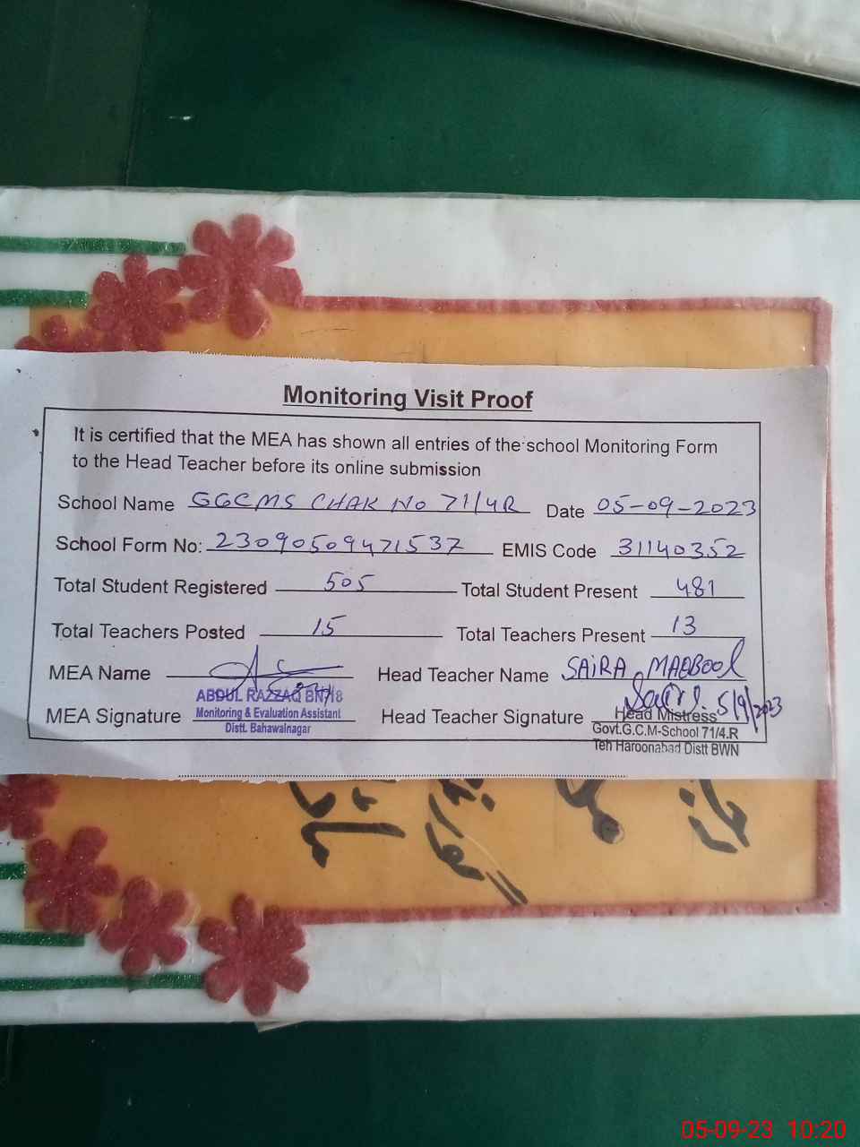 | Attendance Register | Head Teacher | MEA with School | Visit Proof |