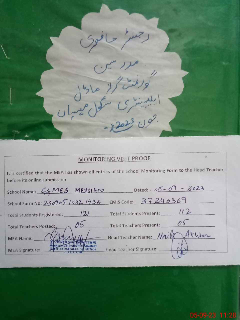 | Certified that this School was Inspected by the Undersigned MEA/DMO Today and the Information Stated Above is as Per Record. | |||||