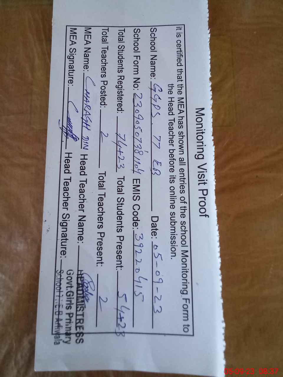 | Attendance Register | Head Teacher | MEA with School | Visit Proof |