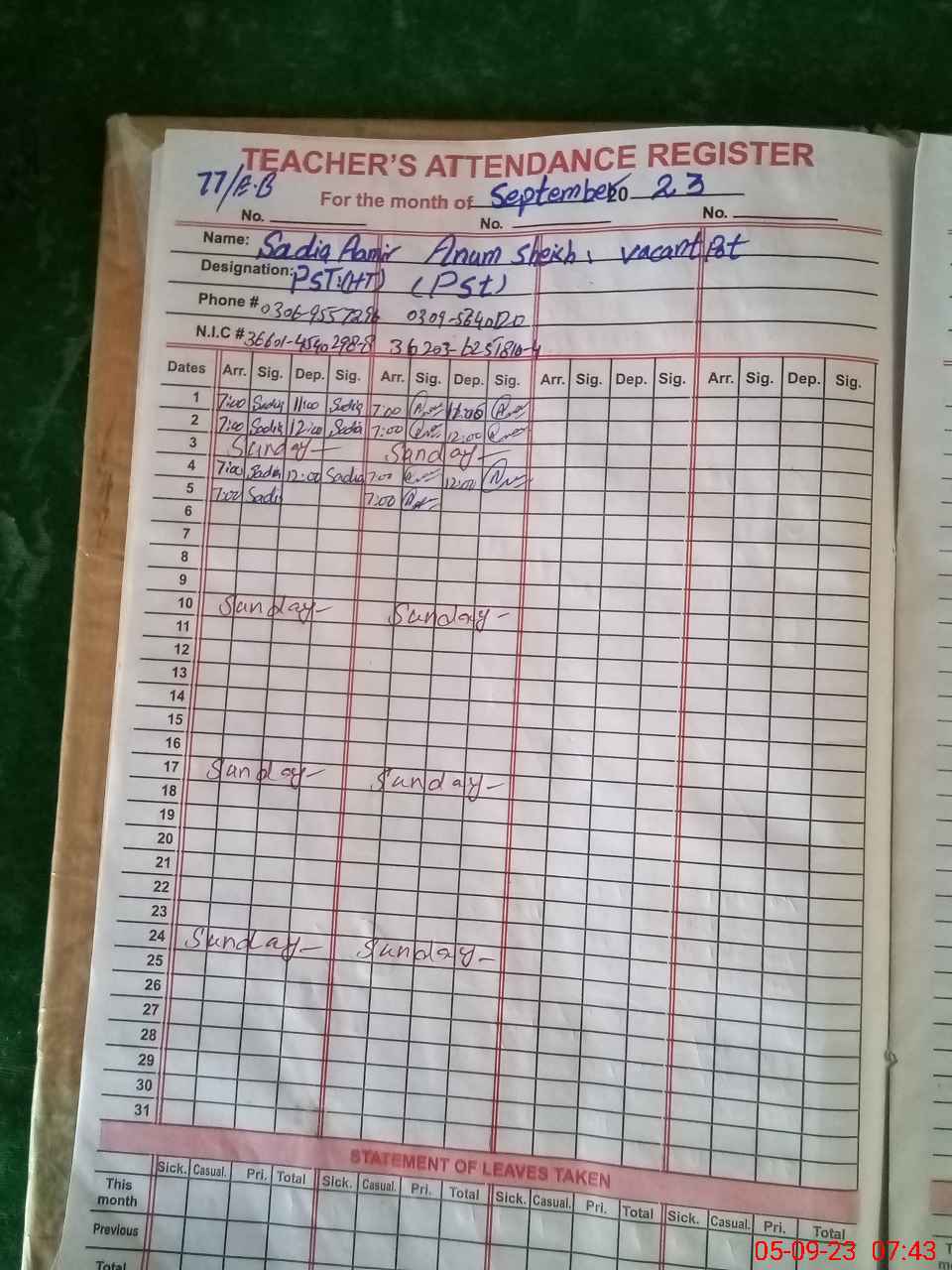 | Name: SA**** AA**** Designation: (School Headmaster's/Headmistress's) PST Phone/Cell Number: 03**** |