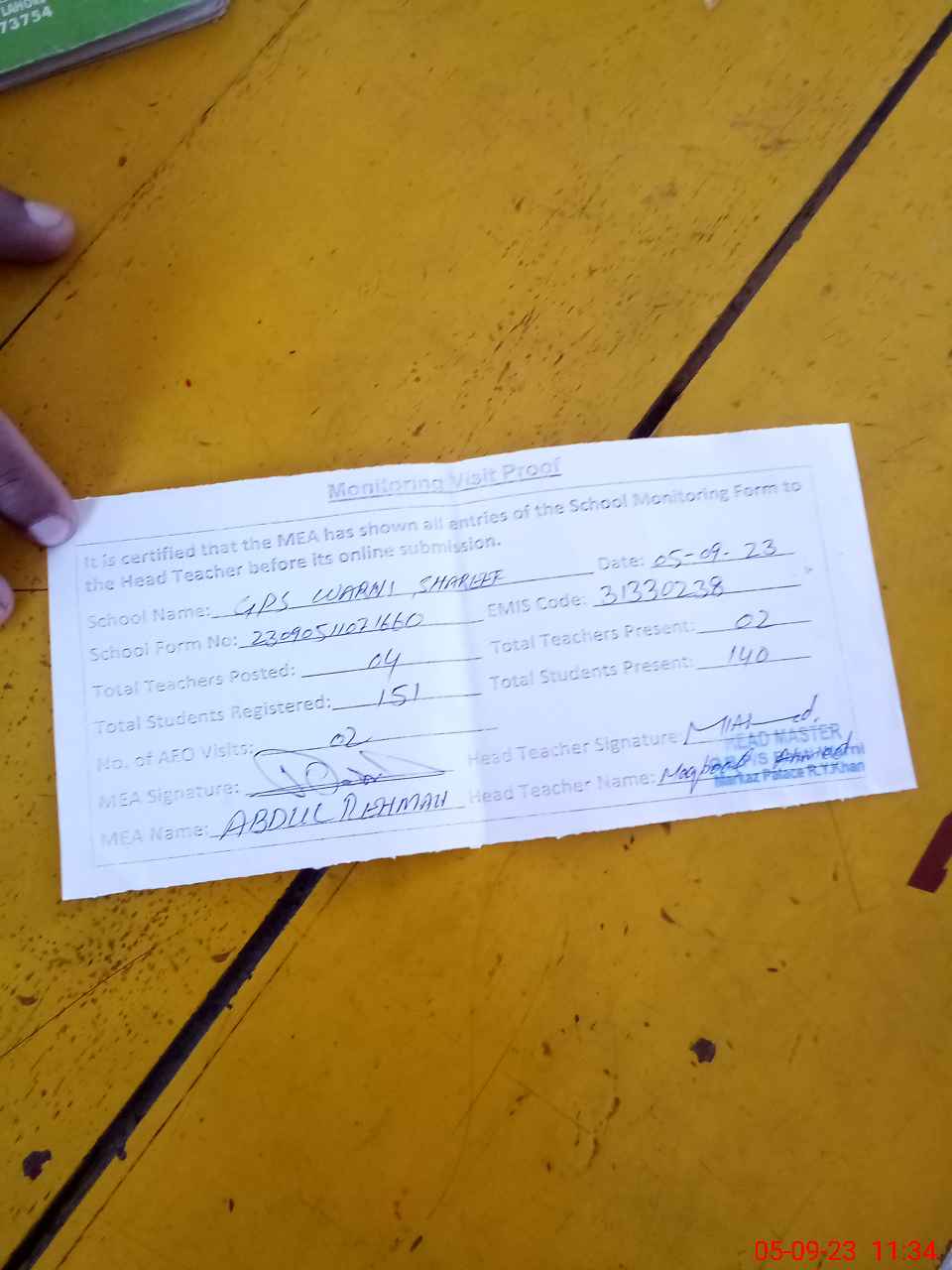 | Attendance Register | Head Teacher | MEA with School | Visit Proof |