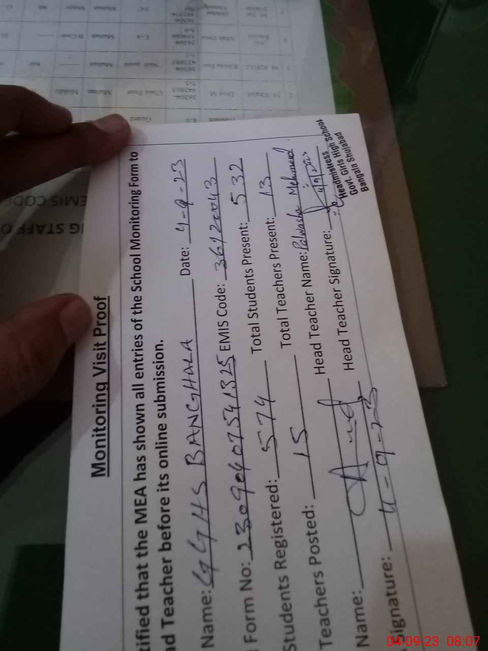 | Attendance Register | Head Teacher | MEA with School | Visit Proof |