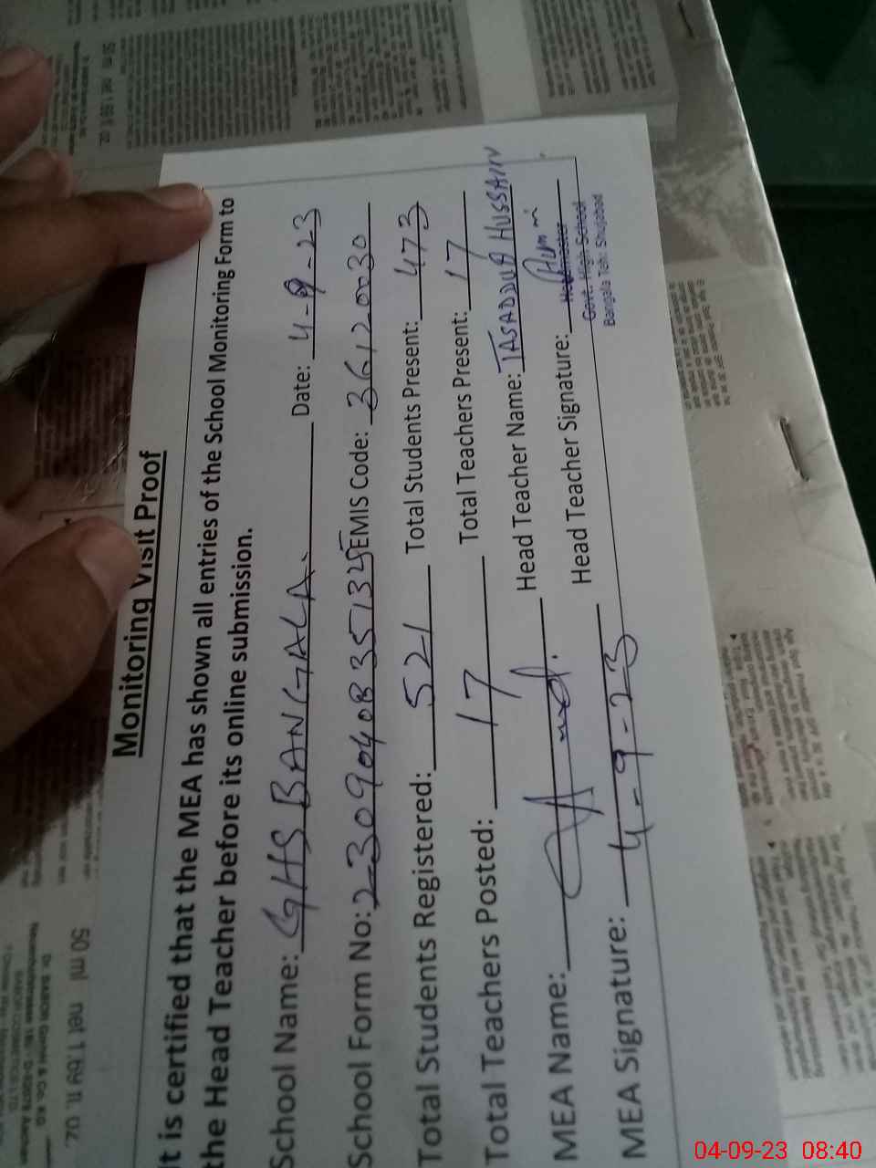 | Attendance Register | Head Teacher | MEA with School | Visit Proof |