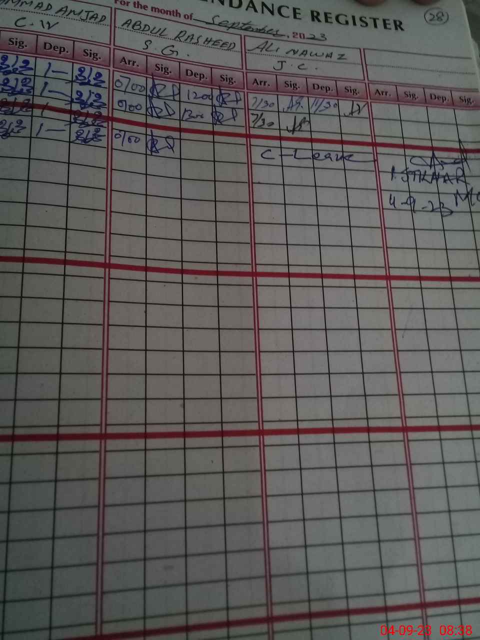 | CNIC | Full Name | Designation | R/C | Absence During Last Calender Month |