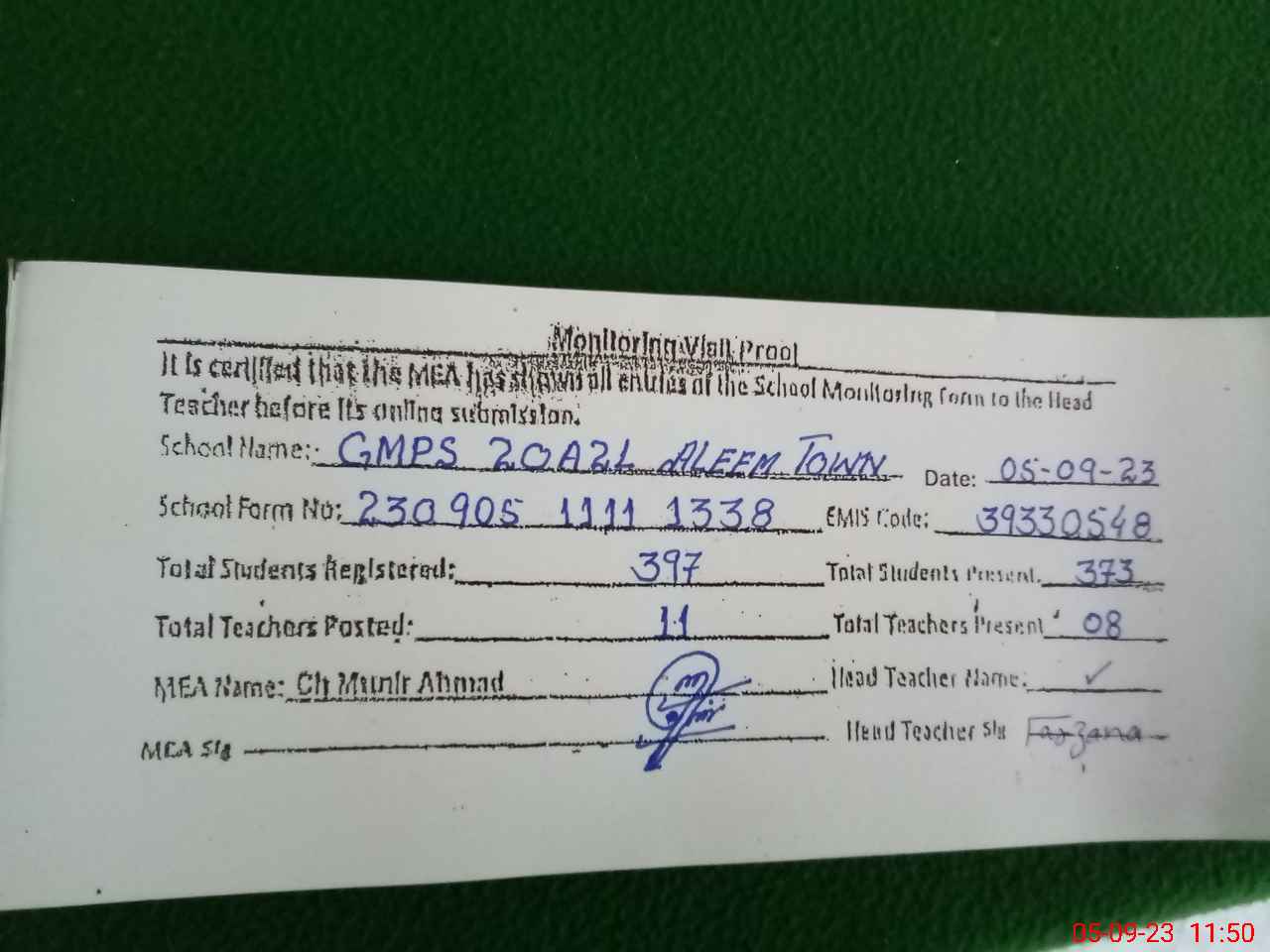 | EMIS Code: 39330548 | Name of School: GMPS 20 A-2L (ALEEM TOWN) | |||