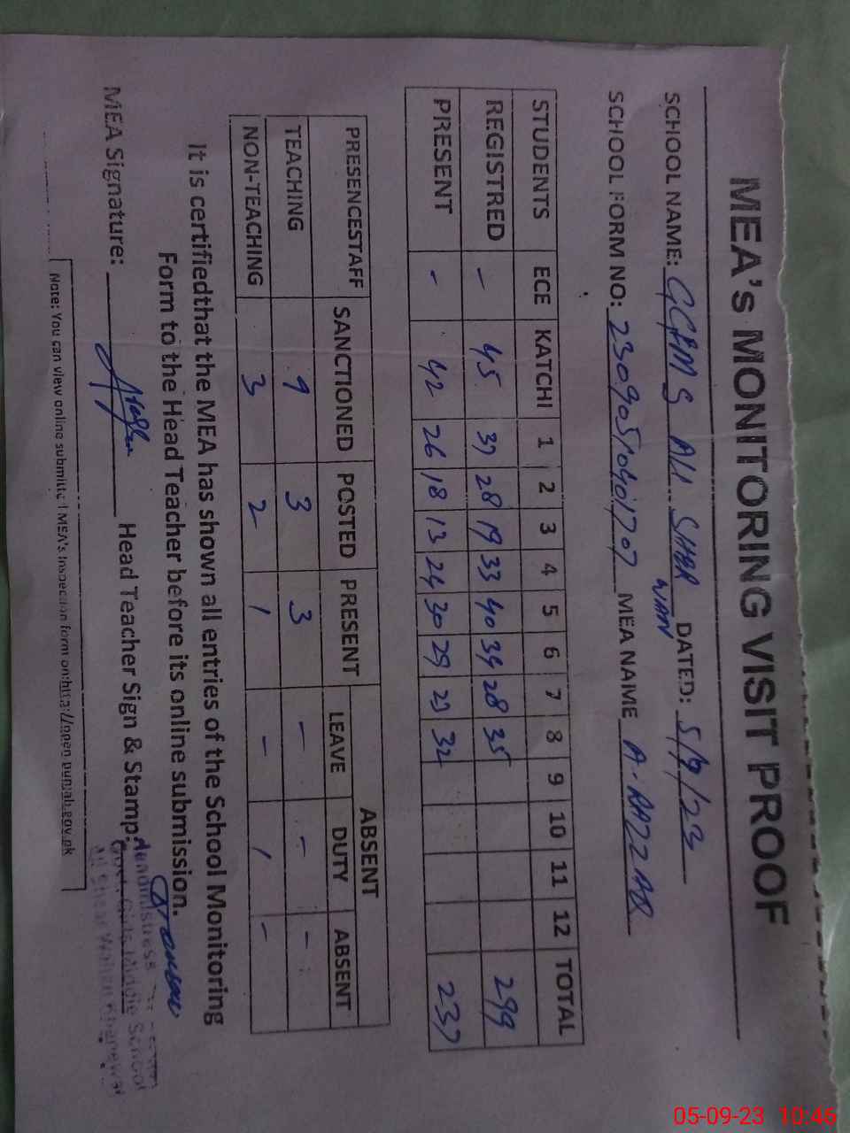 | Attendance Register | Head Teacher | MEA with School | Visit Proof |