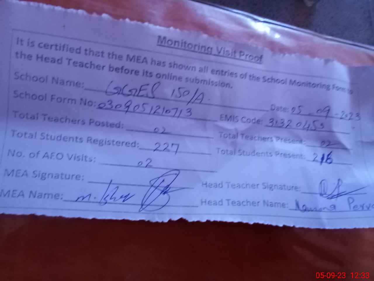 | Attendance Register | Head Teacher | MEA with School | Visit Proof |