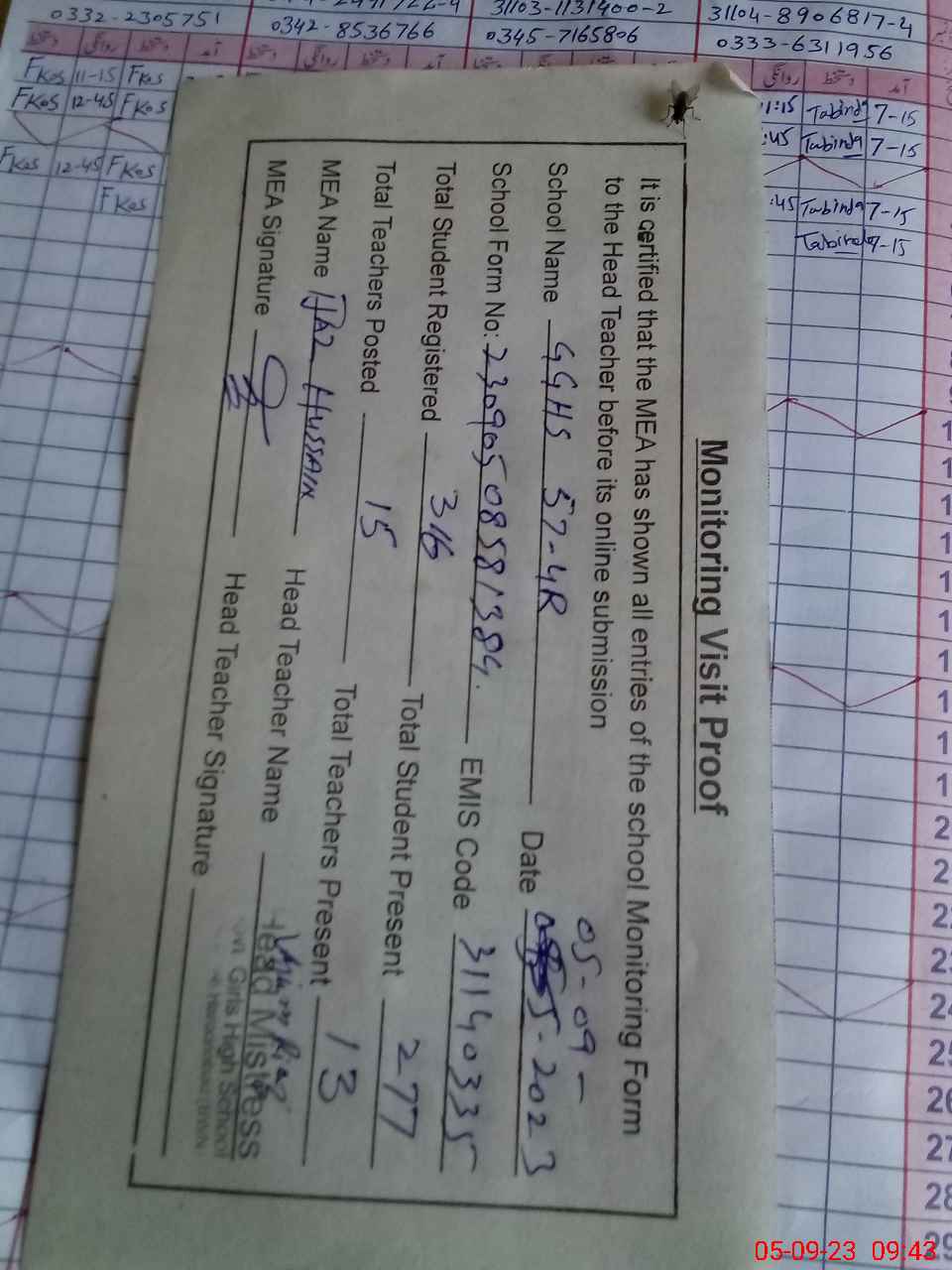 | Certified that this School was Inspected by the Undersigned MEA/DMO Today and the Information Stated Above is as Per Record. | |||||