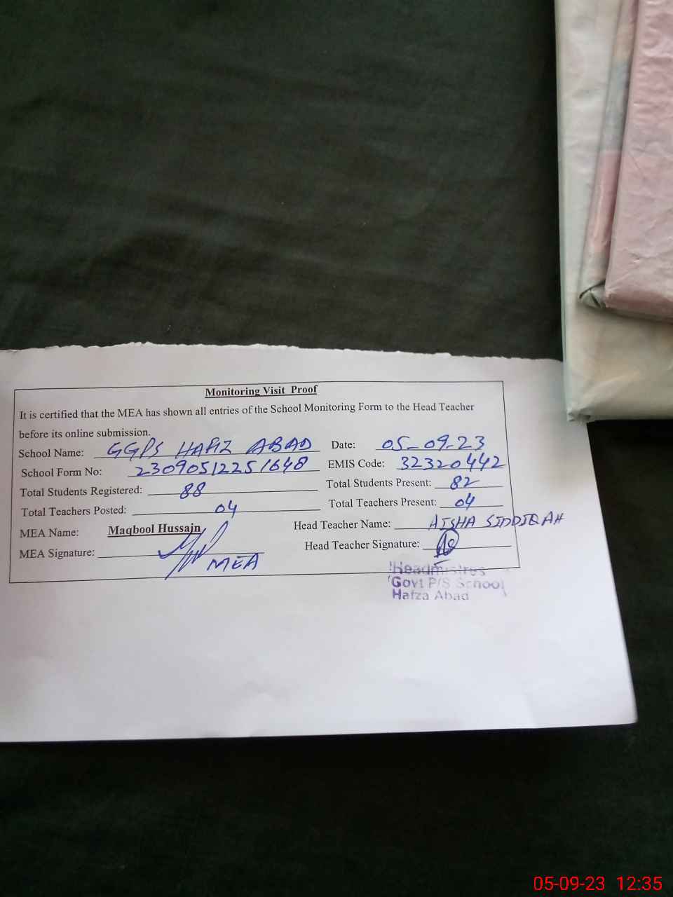 | Attendance Register | Head Teacher | MEA with School | Visit Proof |