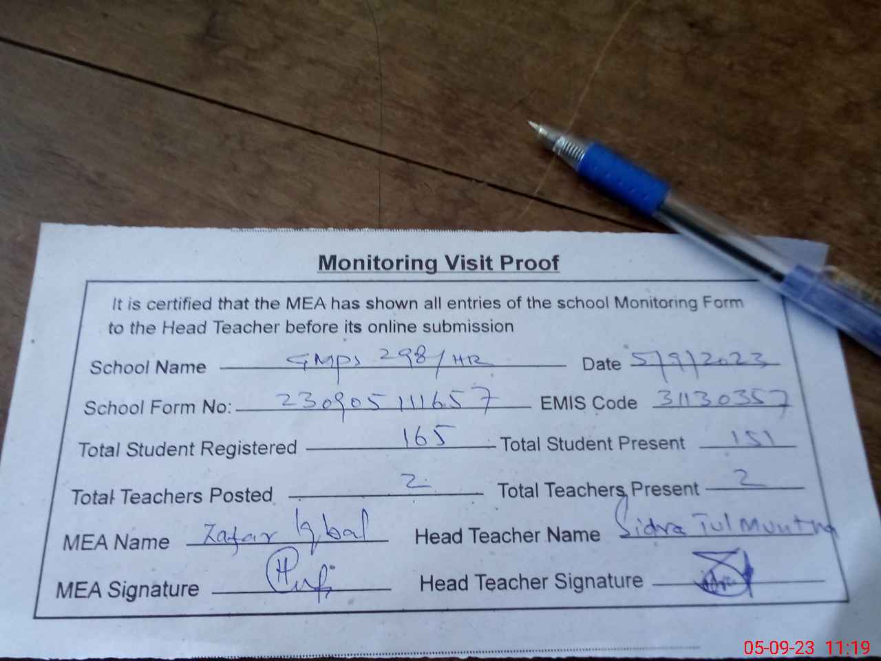 | Monitoring Date: 05-09-2023 | Start Time: 05-09-2023 11:04 AM | End Time: 05-09-2023 11:19 AM | Name of MEA: Za**** Iq**** BN**** | |