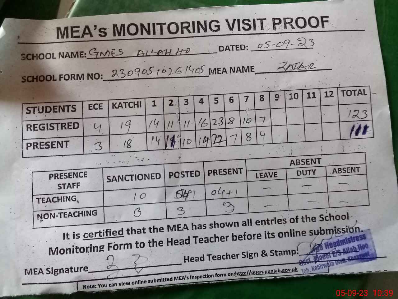 | Attendance Register | Head Teacher | MEA with School | Visit Proof |