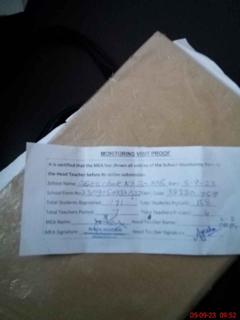 | Attendance Register | Head Teacher | MEA with School | Visit Proof |