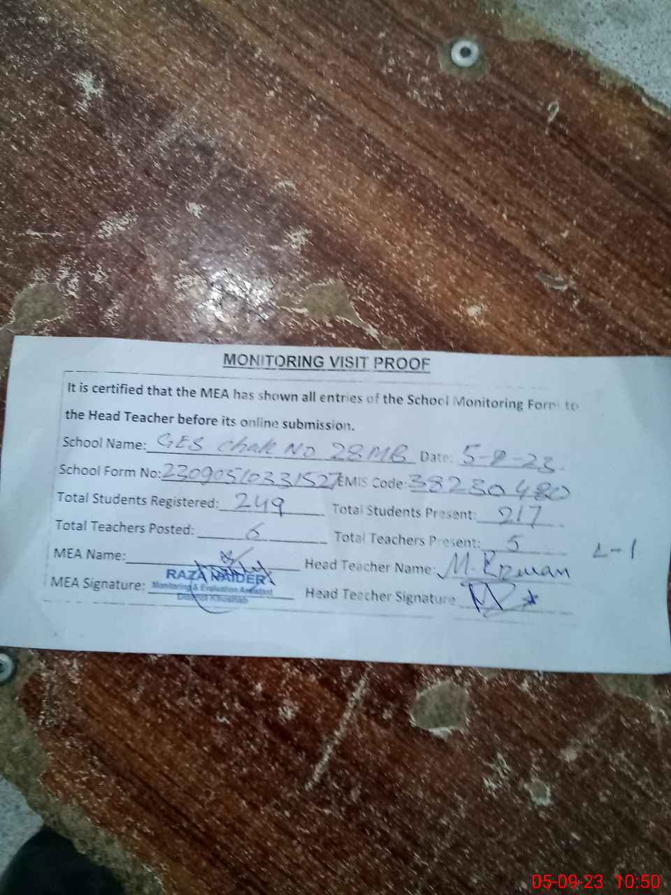 | Attendance Register | Head Teacher | MEA with School | Visit Proof |
