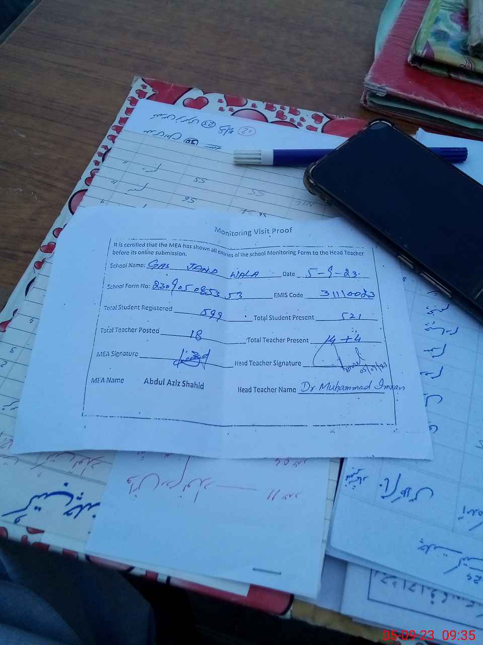 | Attendance Register | Head Teacher | MEA with School | Visit Proof |