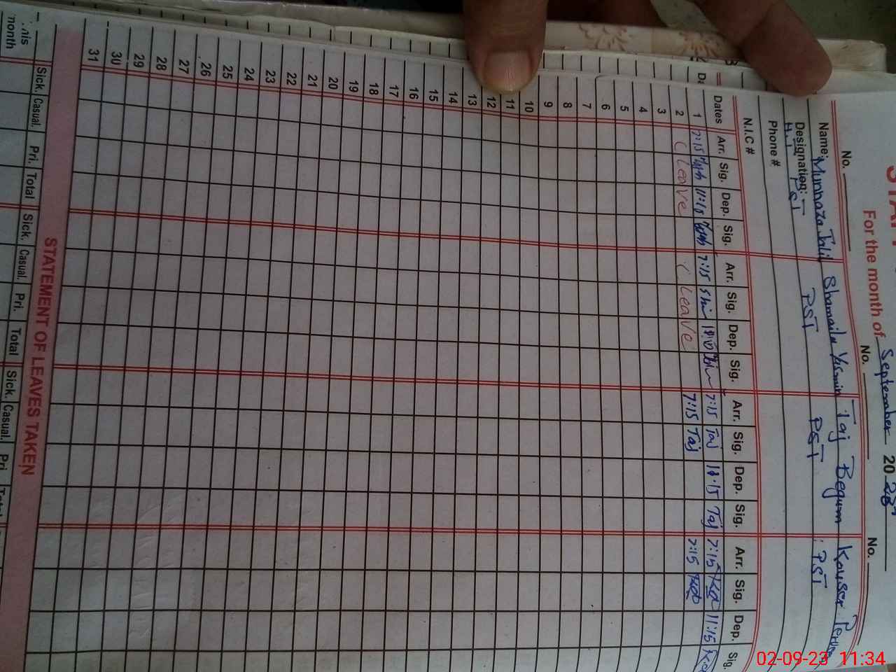 | CNIC | Full Name | Designation | R/C | Absence During Last Calender Month |