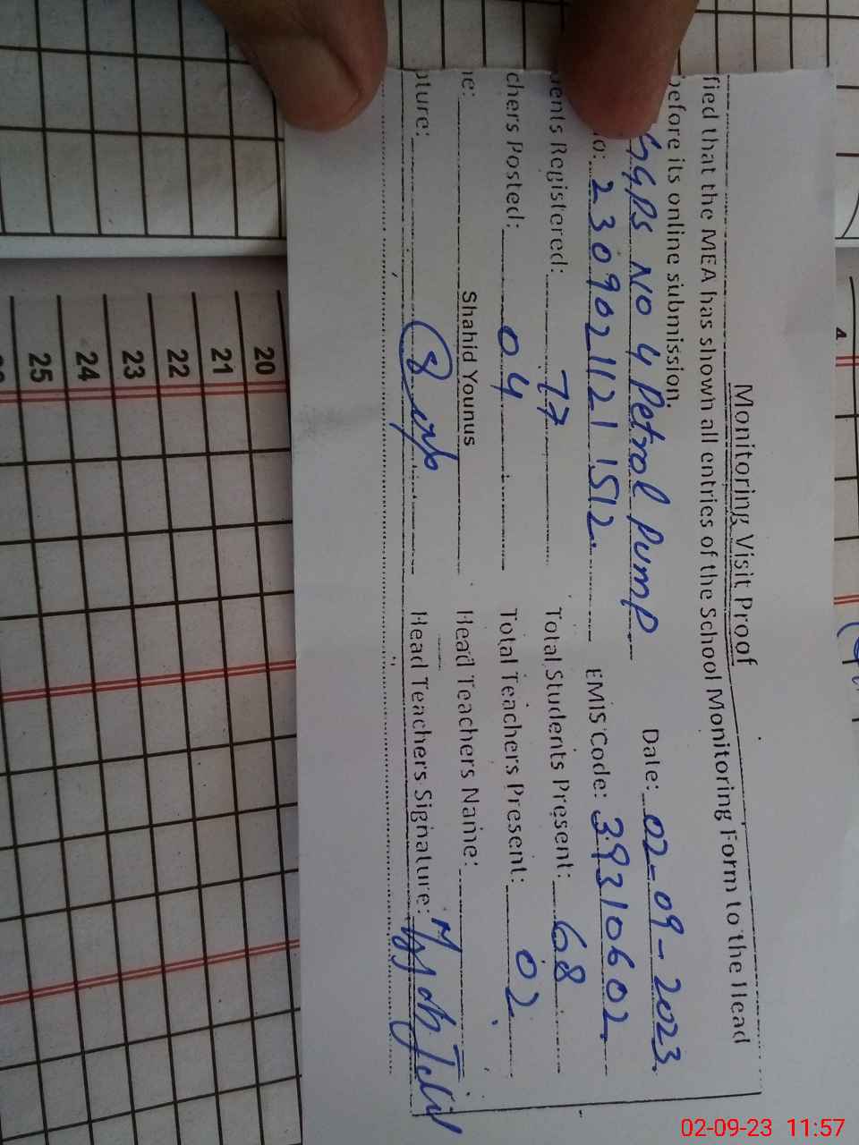| Attendance Register | Head Teacher | MEA with School | Visit Proof |
