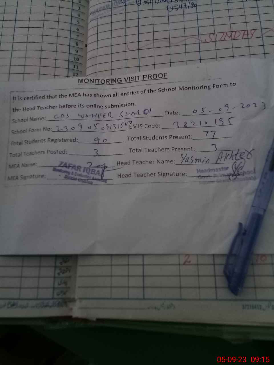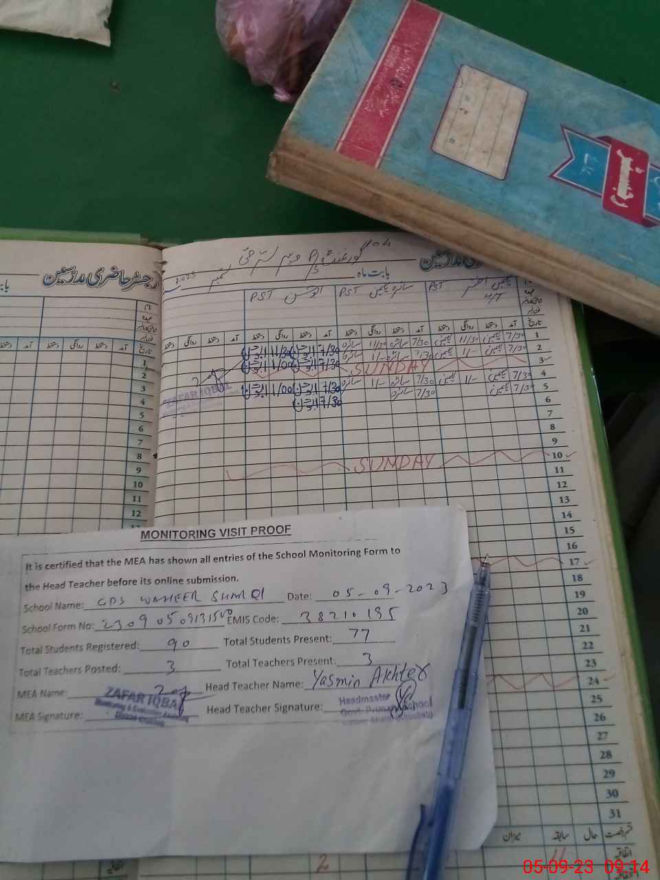 | Attendance Register | Head Teacher | MEA with School | Visit Proof |