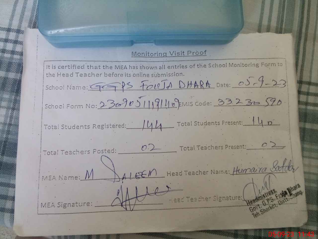 | Attendance Register | Head Teacher | MEA with School | Visit Proof |