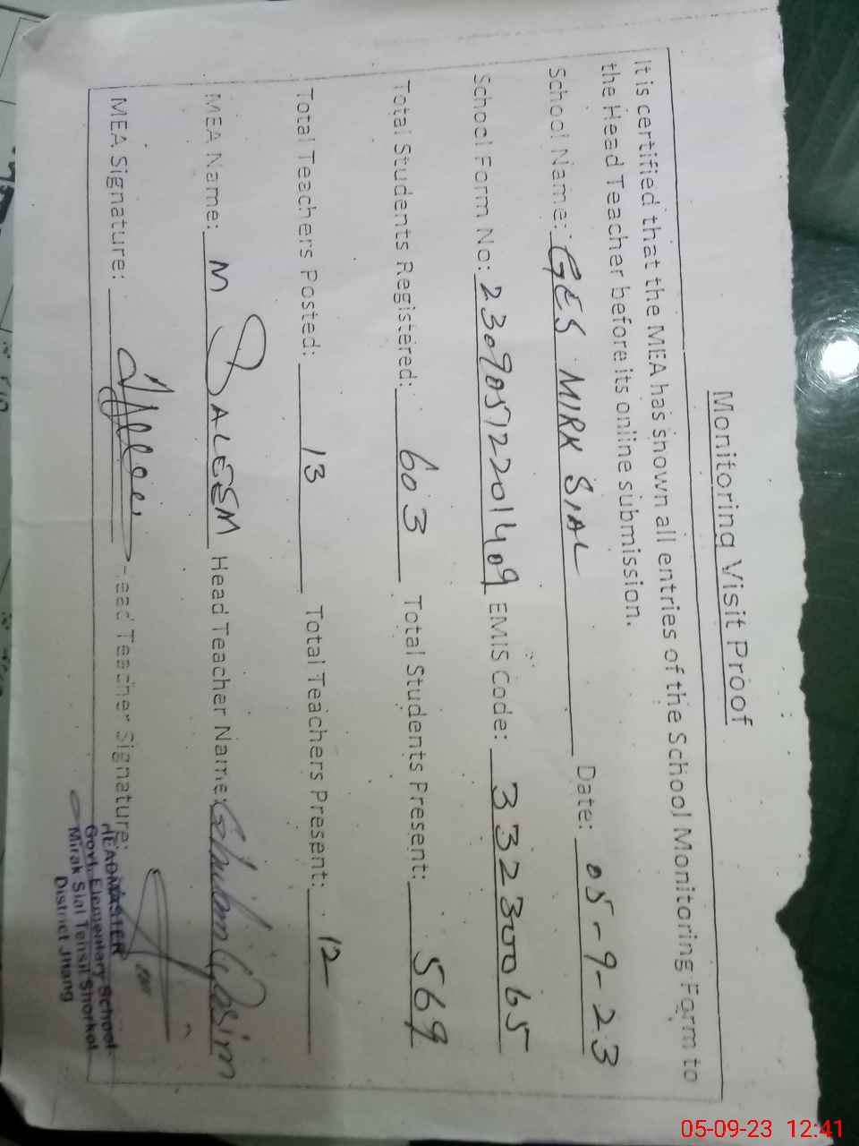 | Attendance Register | Head Teacher | MEA with School | Visit Proof |