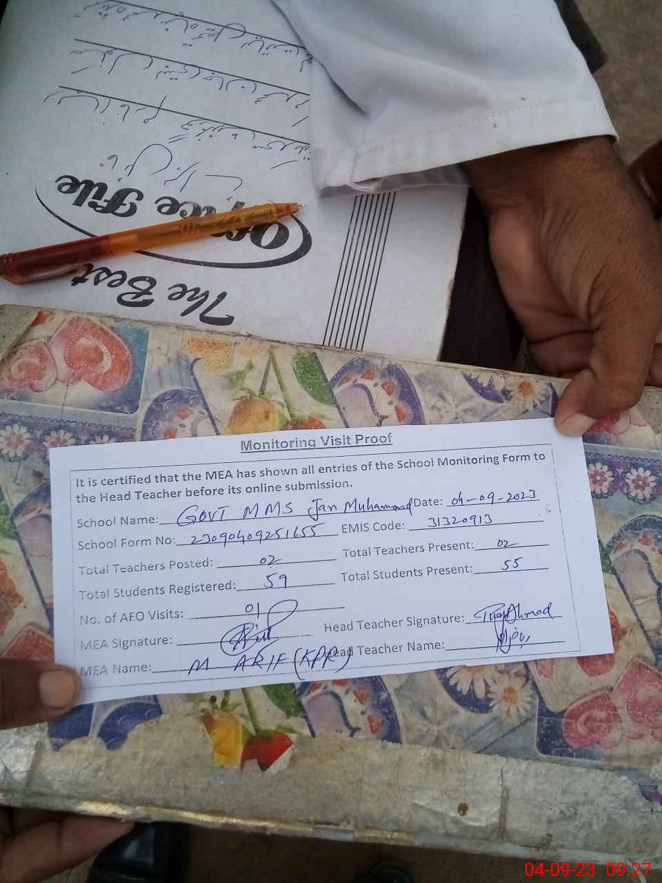 | Attendance Register | Head Teacher | MEA with School | Visit Proof |