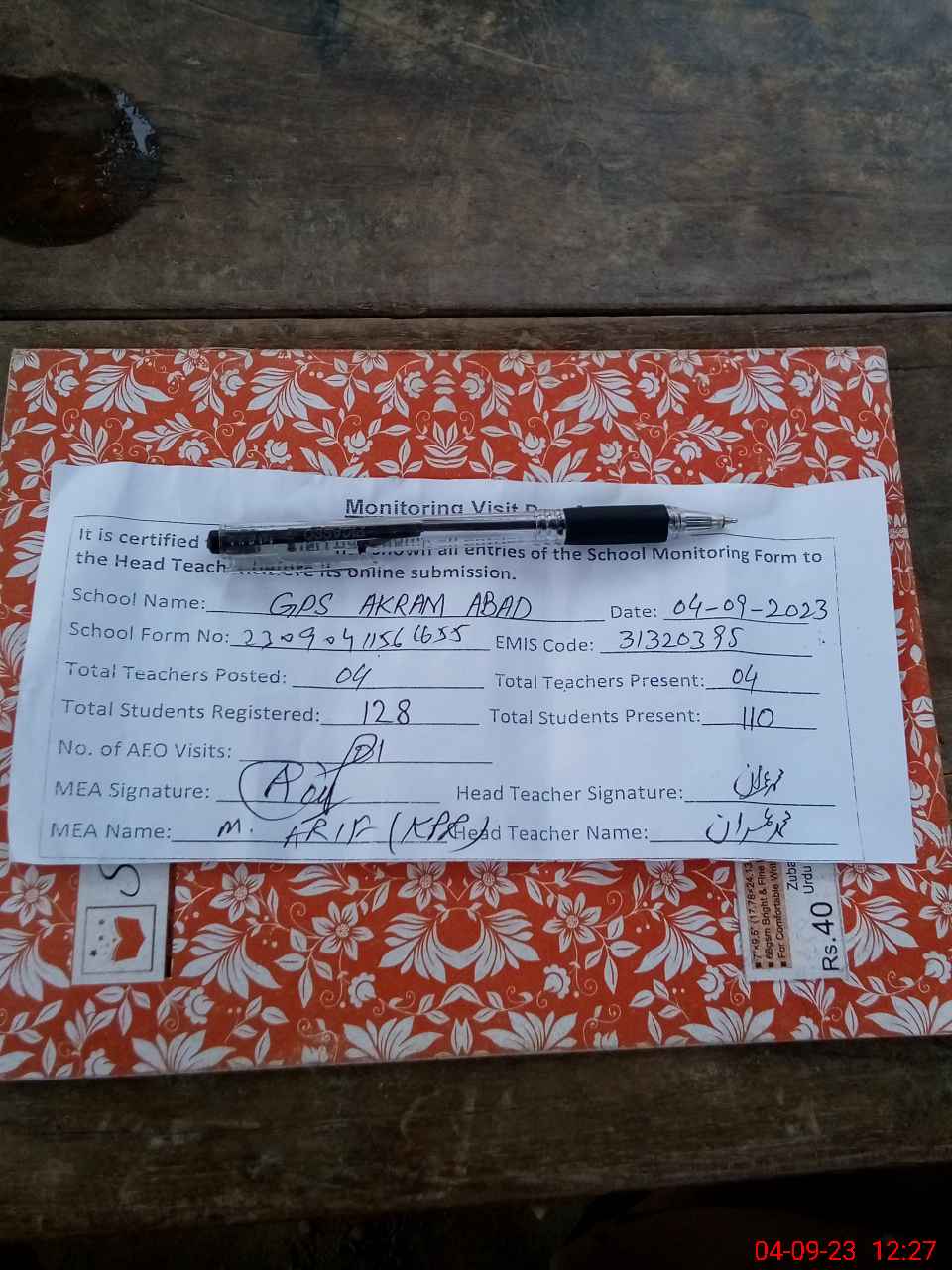 | Attendance Register | Head Teacher | MEA with School | Visit Proof |