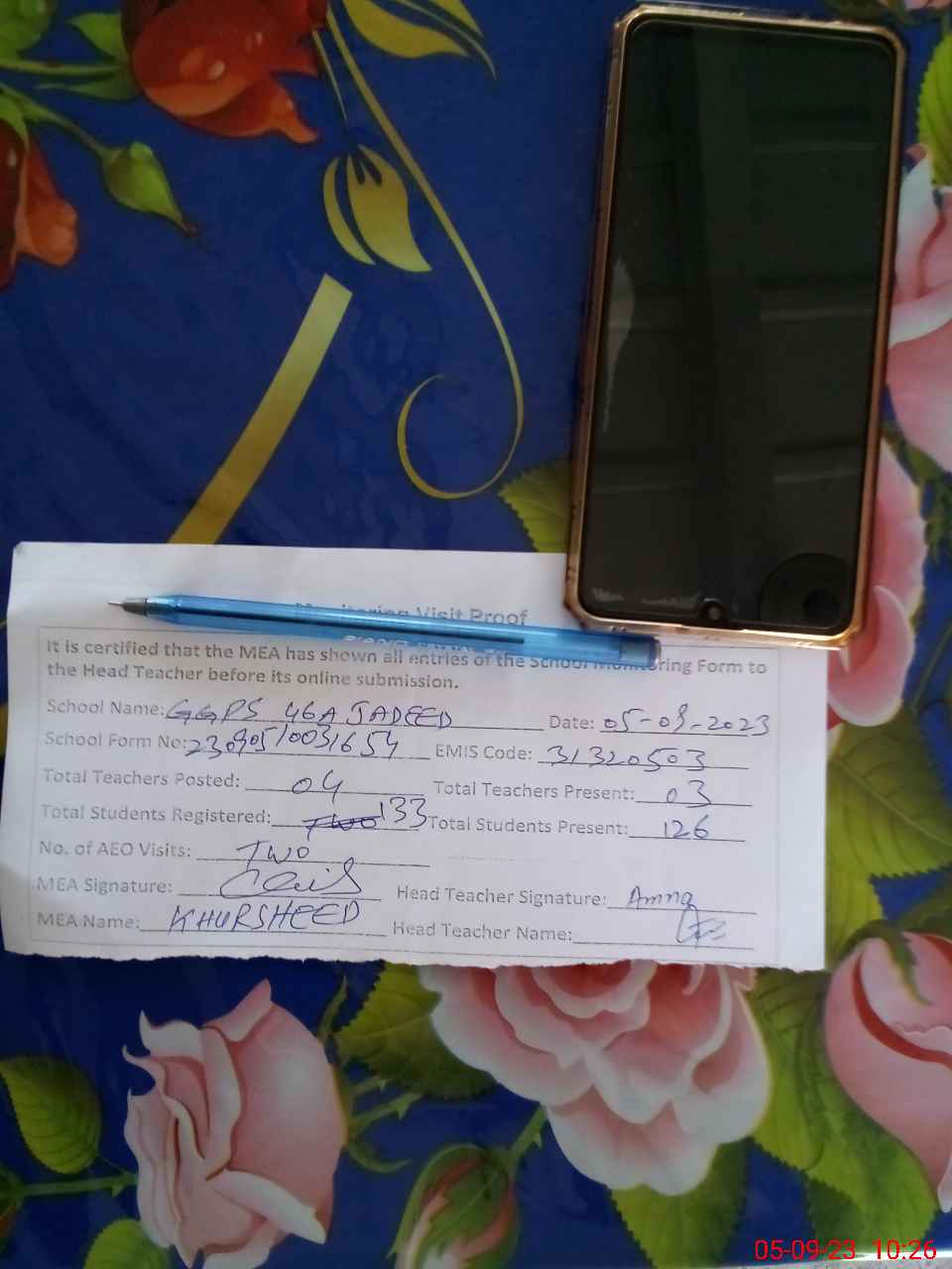 | Attendance Register | Head Teacher | MEA with School | Visit Proof |