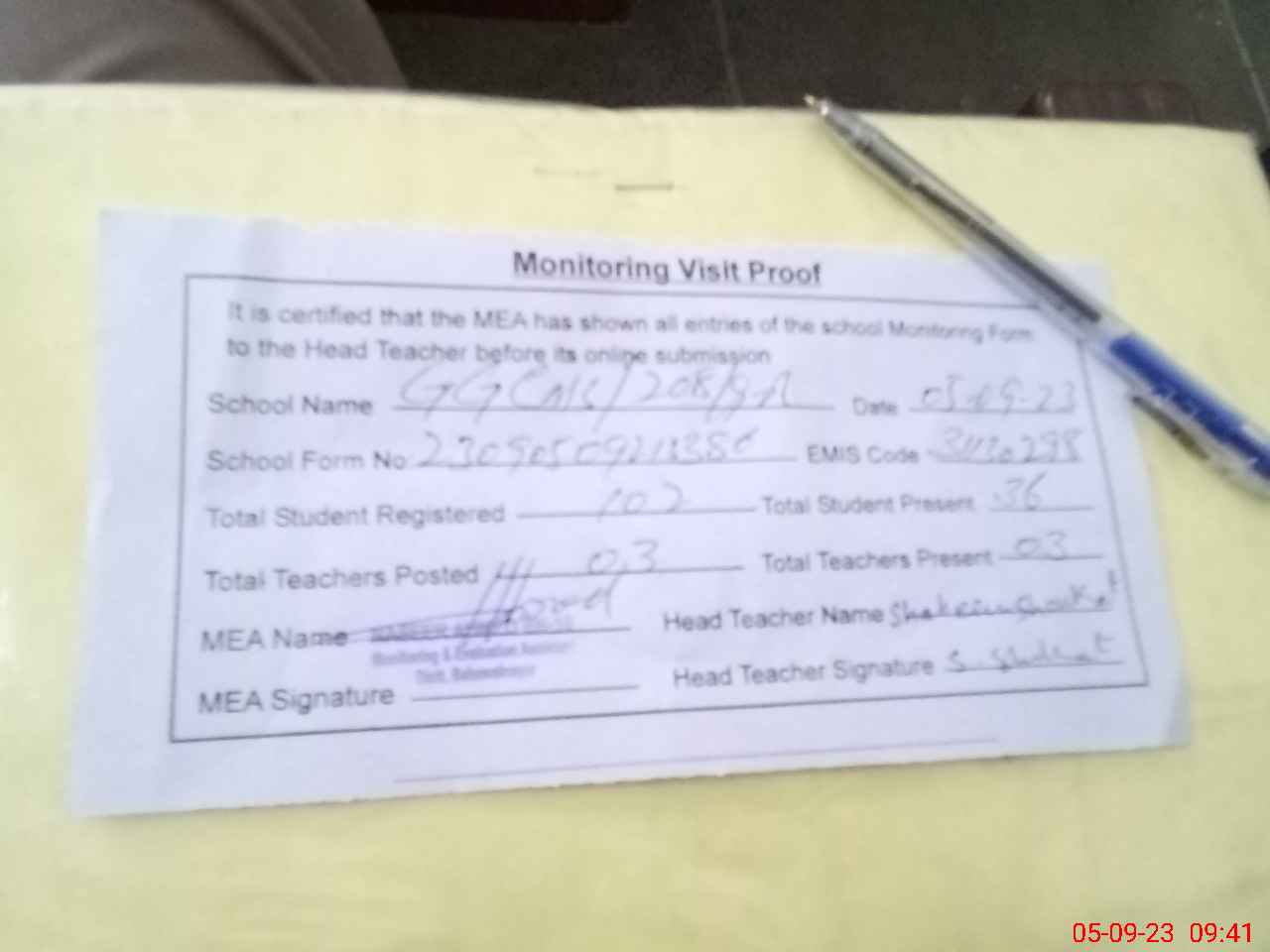 | Attendance Register | Head Teacher | MEA with School | Visit Proof |