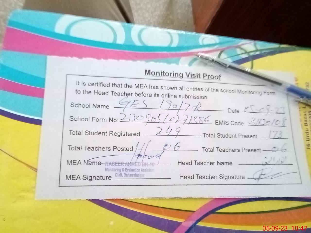 | Attendance Register | Head Teacher | MEA with School | Visit Proof |