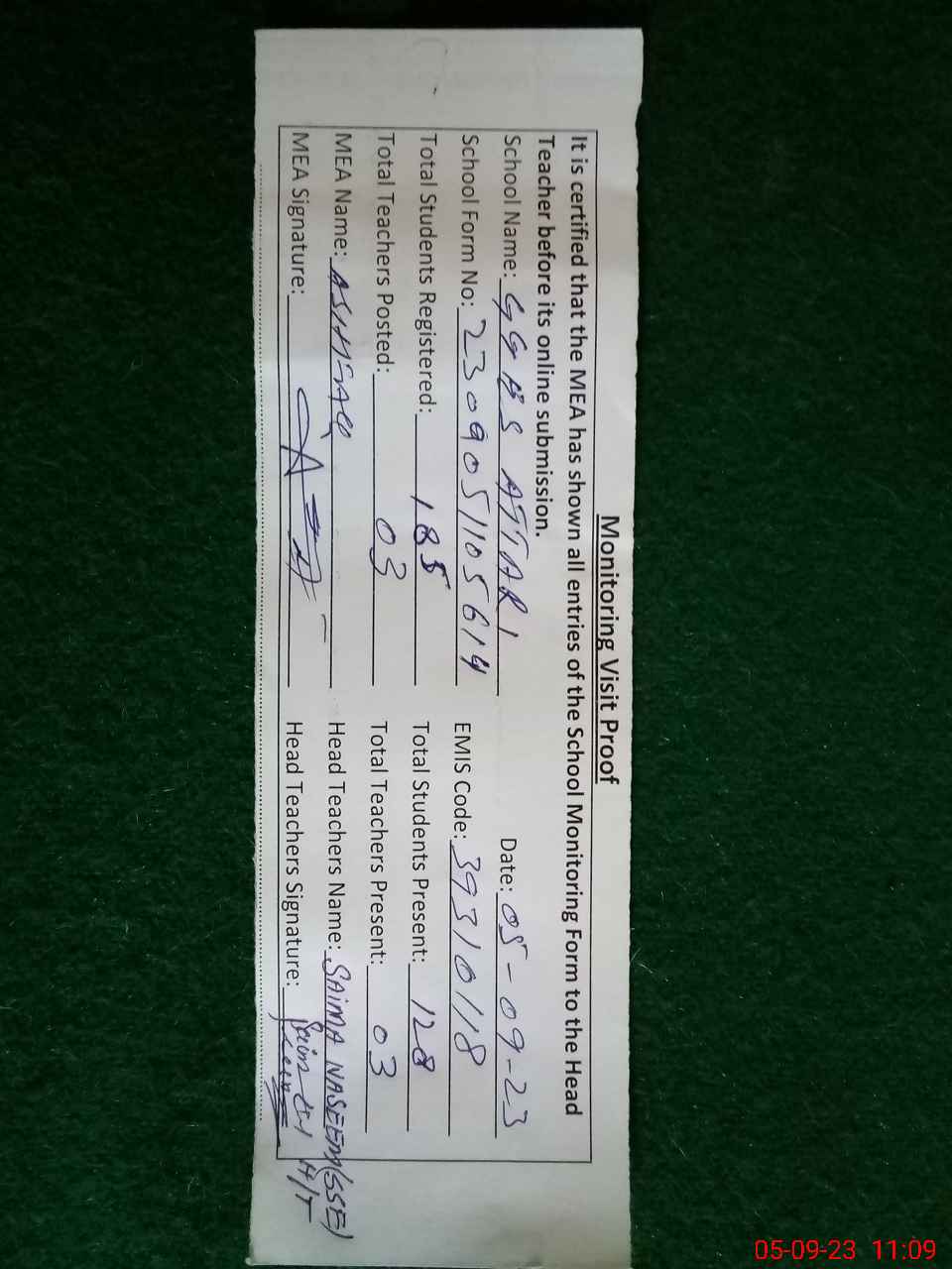 | Attendance Register | Head Teacher | MEA with School | Visit Proof |