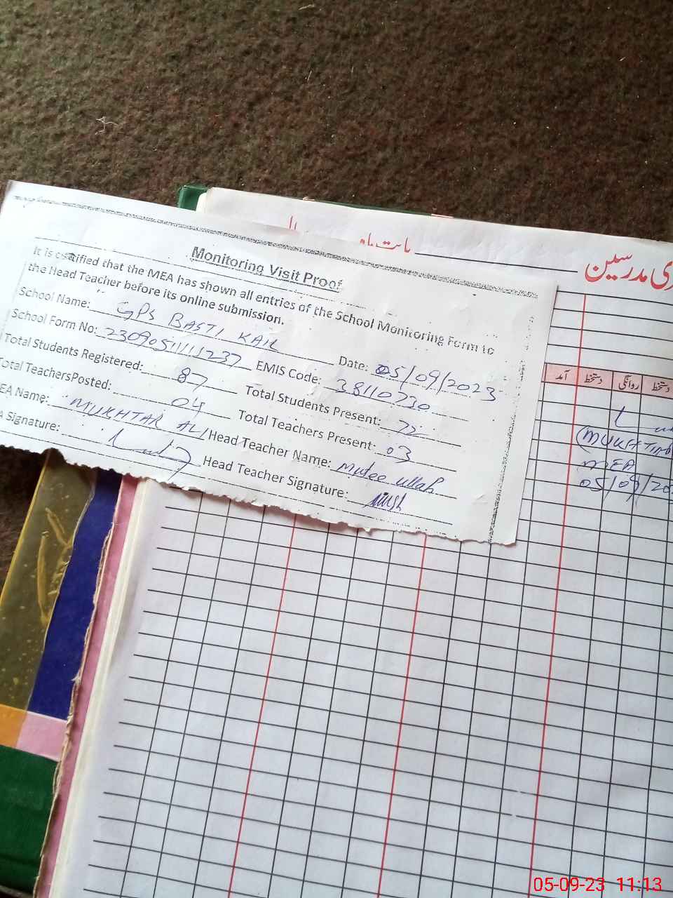| Attendance Register | Head Teacher | MEA with School | Visit Proof |