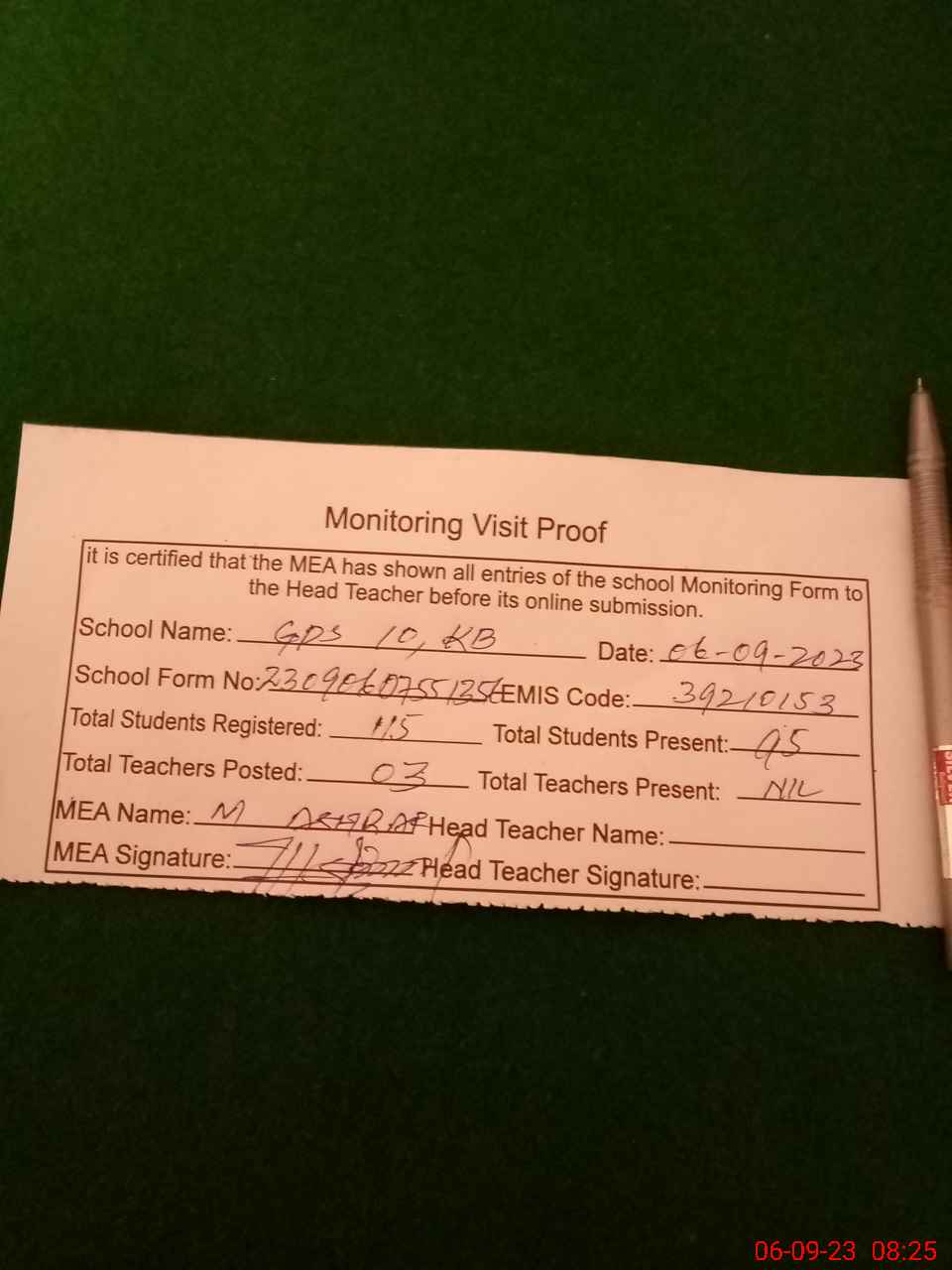 | Attendance Register | Head Teacher | MEA with School | Visit Proof |