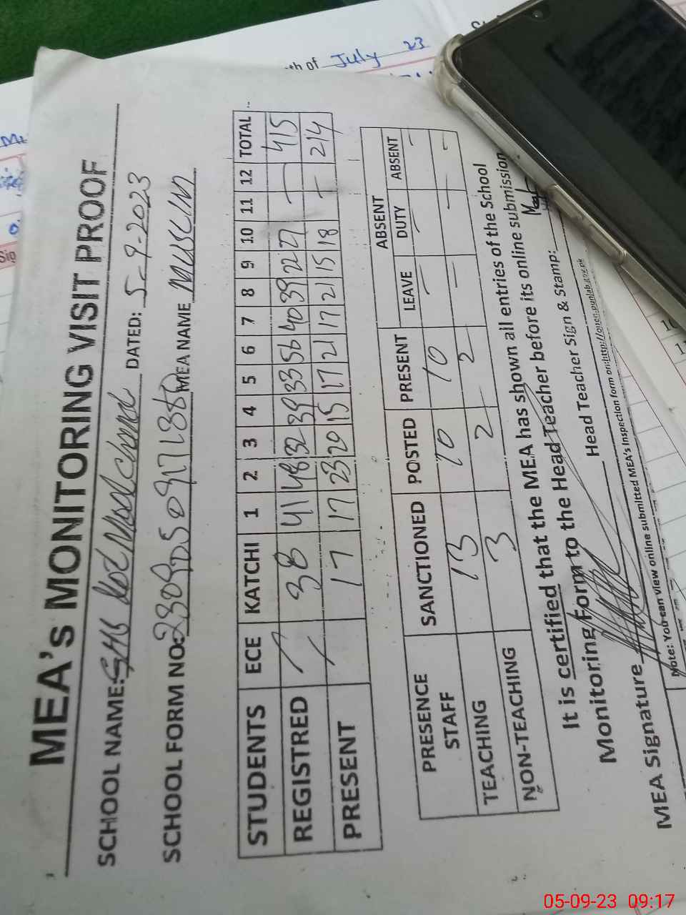 | Attendance Register | Head Teacher | MEA with School | Visit Proof |