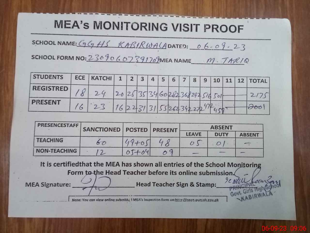 | Attendance Register | Head Teacher | MEA with School | Visit Proof |