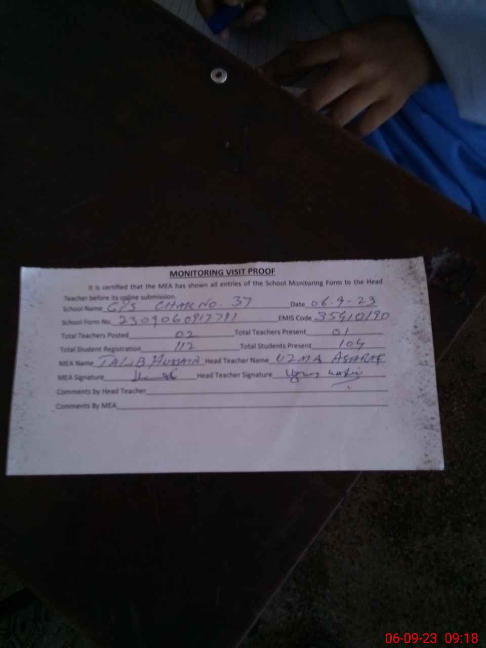 | Attendance Register | Head Teacher | MEA with School | Visit Proof |
