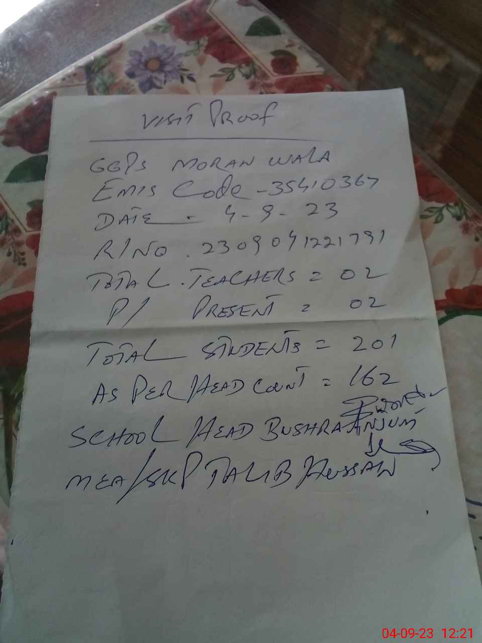 | EMIS Code: 35410367 | Name of School: GGPS MORAN WALA | |||
