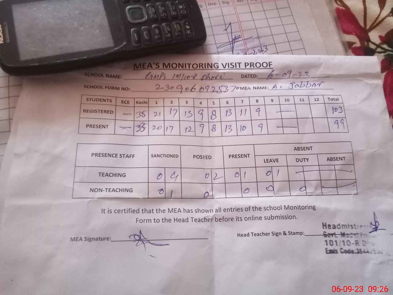 | Attendance Register | Head Teacher | MEA with School | Visit Proof |