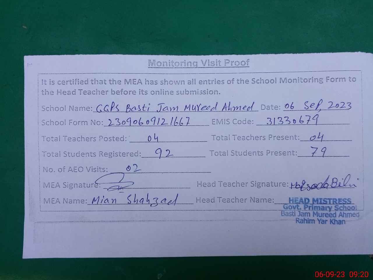 | EMIS Code: 31330679 | Name of School: GGPS BASTI JAM MUREED AHMED | |||
