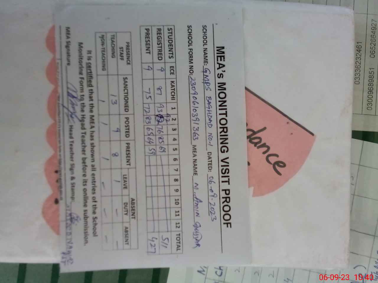 | Attendance Register | Head Teacher | MEA with School | Visit Proof |